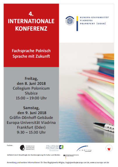 Das Sprachenzentrum der Europa-Universität Viadrina in Zusammenarbeit mit dem Herkunftssprachenzentrum der Technischen Universität Darmstadt und der Bundesvereinigung der Polnischlehrkräfte organisiert die vierte internationale Konferenz in der Konferenzreihe – Fachsprachenunterricht am Beispiel des Polnischen als Fremdsprache.